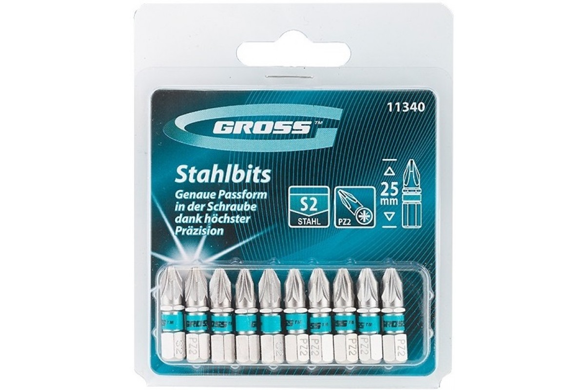 Набор бит Gross 11340 состоит из 10 насадок типоразмера PZ2 и длиной 25 мм, с хвостовиком 1/4 дюйма, изготовленных из стали S2 и предназначенных для шуруповертов. Оснастки служат для монтажа и демонтажа шурупов, саморезов и других резьбовых соединений. Шлиц PZ имеет 4 дополнительных ребра, благодаря чему предотвращается проскальзывание биты в крепеже, повышаются точность и эффективность работ.