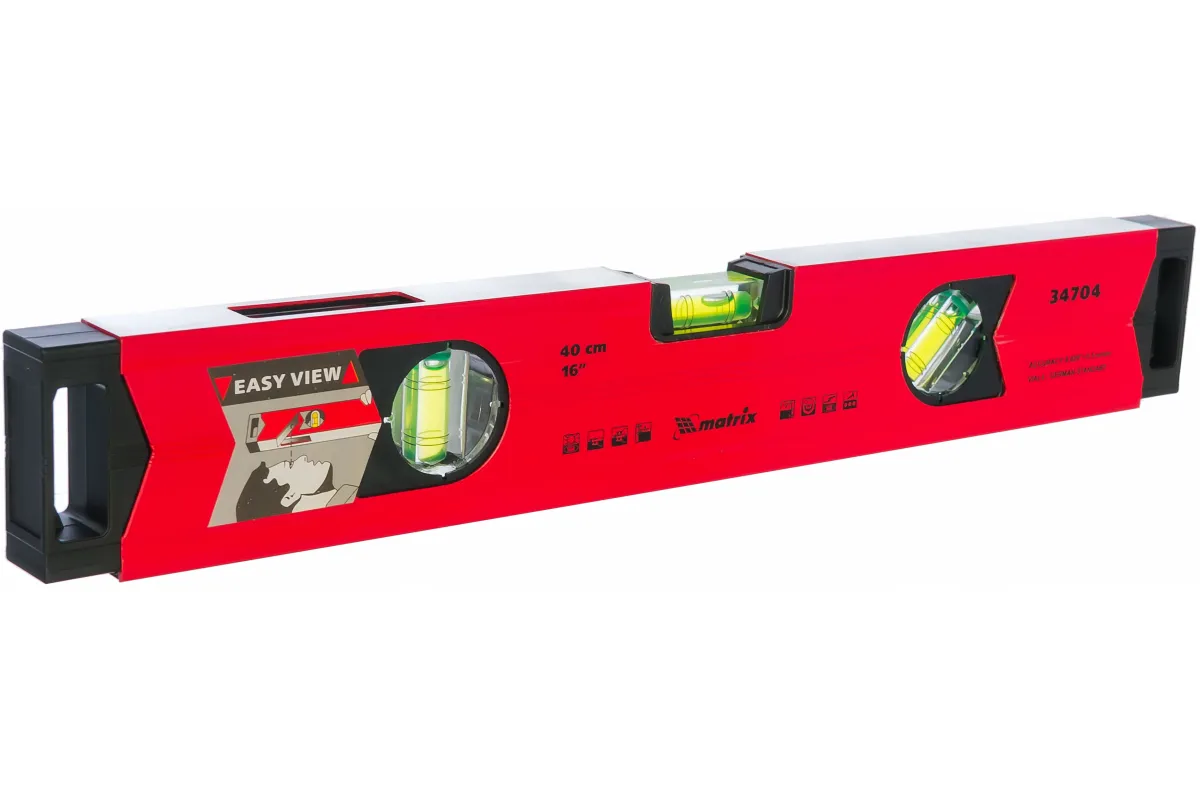 Алюминиевый магнитный уровень Matrix 34704 длиной 400 мм, усиленный, оснащен 3 глазками и одним зеркальным отражателем. С его помощью можно выявить отклонения от вертикали, горизонтали и угла 45 градусов. Встроенный зеркальный глазок повышает удобство работы, позволяя легко считывать показания.;Для определения отклонения вертикали 90 градусов необходимо использовать пузырьковую ампулу только в верхнем положении уровня. Только базовая поверхность является рабочей (противоположная ампуле 180 градусов).