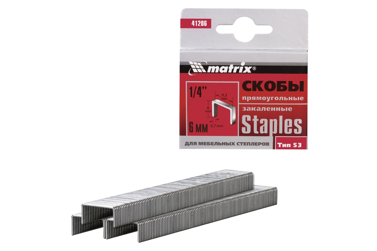 Закаленные скобы Matrix 41206 для мебельного степлера, тип 53, размером 6 х 11,3 х 0,7 мм, 1000 шт. в коробке, помогут обить мебель, зафиксировать утеплитель, а также выполнить другие отделочные и ремонтные работы. Скобы крепко соединяют различные материалы: древесину, фанеру, картон, ДСП.