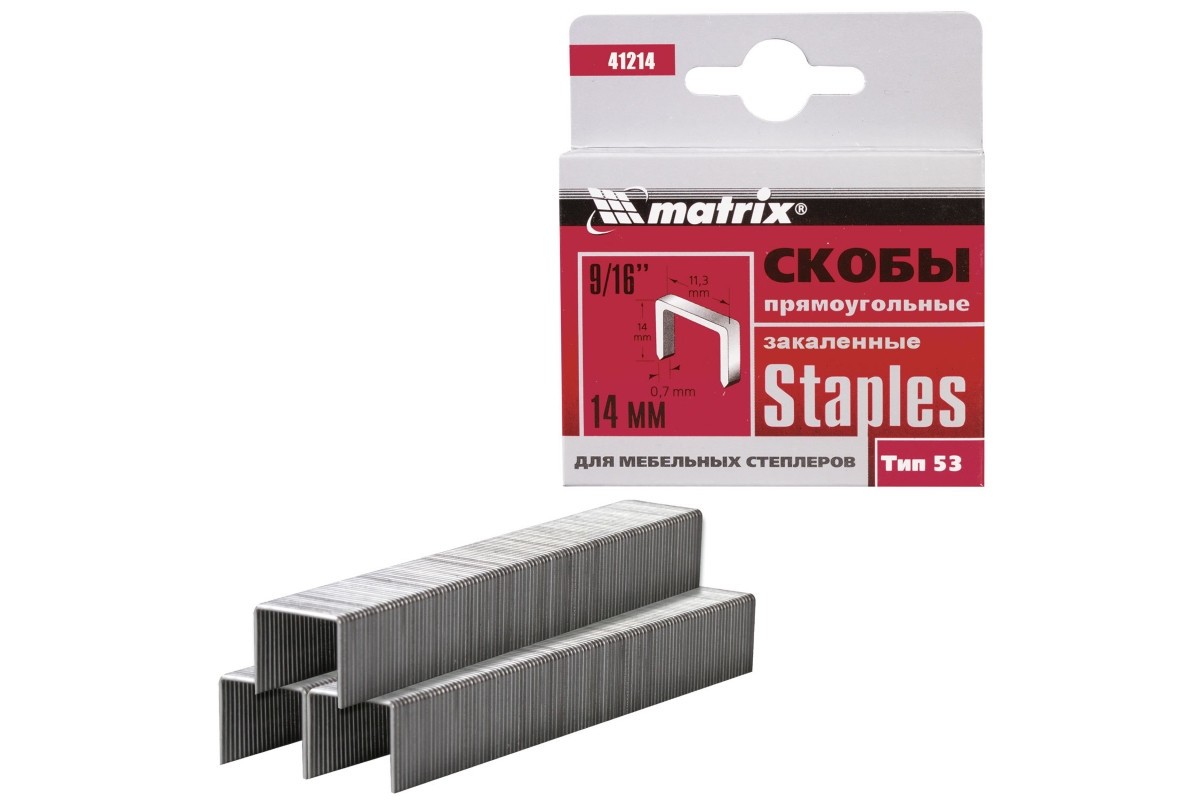 Закаленные скобы Matrix 41214 для мебельного степлера, тип 53, размером 14 х 11,3 х 0,7 мм, 1000 шт. в коробке, помогут обить мебель, зафиксировать утеплитель, а также выполнить другие отделочные и ремонтные работы. Скобы крепко соединяют различные материалы: древесину, фанеру, картон, ДСП.