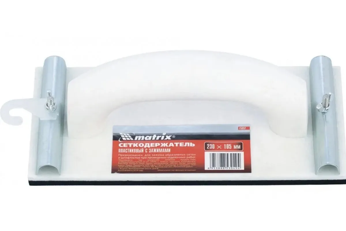 Пластиковый сеткодержатель Matrix 75852 с подошвой 230 х 105 мм, с зажимами, используется для ручного шлифования деревянных, шпатлеванных, металлических, пластмассовых и прочих твердых поверхностей. Сеткодержатель фиксирует абразивную стеклосетку или шлифлист и позволяет удалять старые отделочные покрытия, подготавливать поверхность под покраску, а также выполнять чистовую обработку.