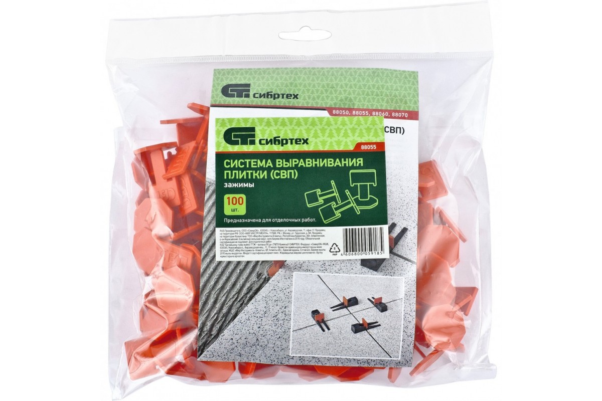 Система выравнивания плитки (СВП) Сибртех 88055 состоит из зажимов (100 шт. в пакете), используемых совместно с клиньями. Изделия позволяют добиться качественного результата за счет того, что межплиточные швы получаются ровными и аккуратными, керамическая или керамогранитная плитка не смещается, а клей распределяется равномерно. Зажимы для плитки (СВП) предназначены для формирования швов 1,5-1,7 мм.