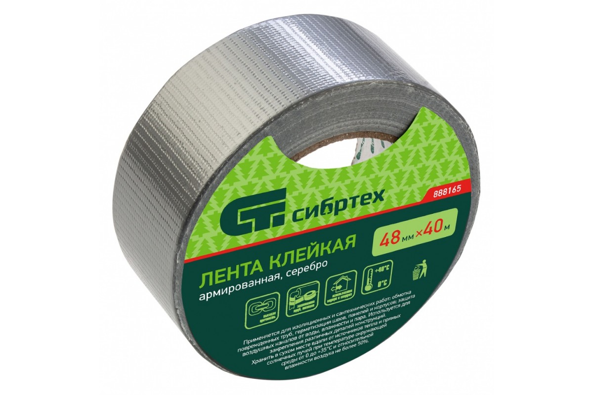 Клейкая армированная лента Сибртех 888165 размером 48 мм х 40 м, цвета серебра, используется для проведения изоляционных, сантехнических и монтажных работ. Применяется для обмотки поврежденных труб, герметизации швов, панелей и корпусов. Обеспечивает надежную изоляцию от влажности и пара. Позволяет также закреплять детали различных конструкций.
