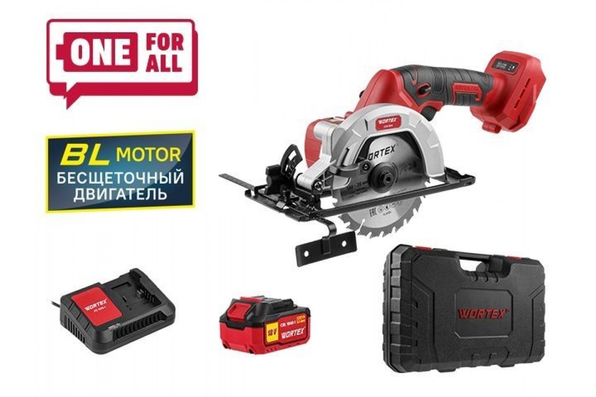 Аккум. циркулярная пила WORTEX CCS 1814 в чем. ALL1 XLT SET БЕСЩЕТ., 18 В, до 45 мм, 1х4 А*ч, з/у (140х20 мм, рез под углом 45)