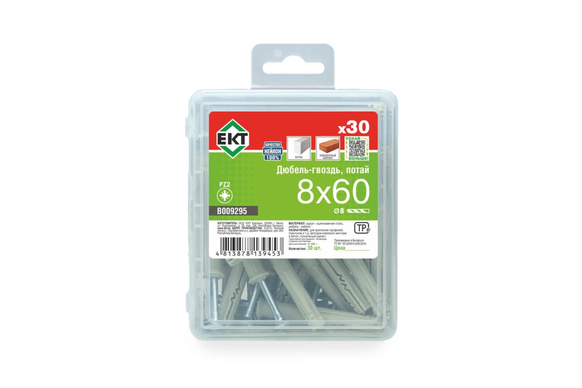 Дюбель быстрого монтажа с гвоздевым шурупом, потай 8х60, НЕЙЛОН, ЕКТ, в пласт. контейнере (упак/30шт)