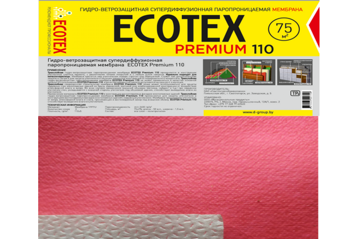 Гидро-ветрозащитная паропроницаемая мембрана ECOTEX Premium 110 применяется в конструкции утепленных скатных кровель, с различными типами покрытий и с любым углом наклона.. Идеально подходит для металлочерепицы. Мембрана крепится над утеплителем поверх стропил под обрешеткой. Служит как дополнительная защита от ветра и для защиты утеплителя и несущих элементов конструкций от подкровельного конденсата. Гидро-ветрозащитная паропроницаемая мембрана ECOTEX Premium 110 не может применяться в качестве основной кровли! Использование ECOTEX Premium 110 в качестве временной кровли допускается на срок до 4-х месяцев.