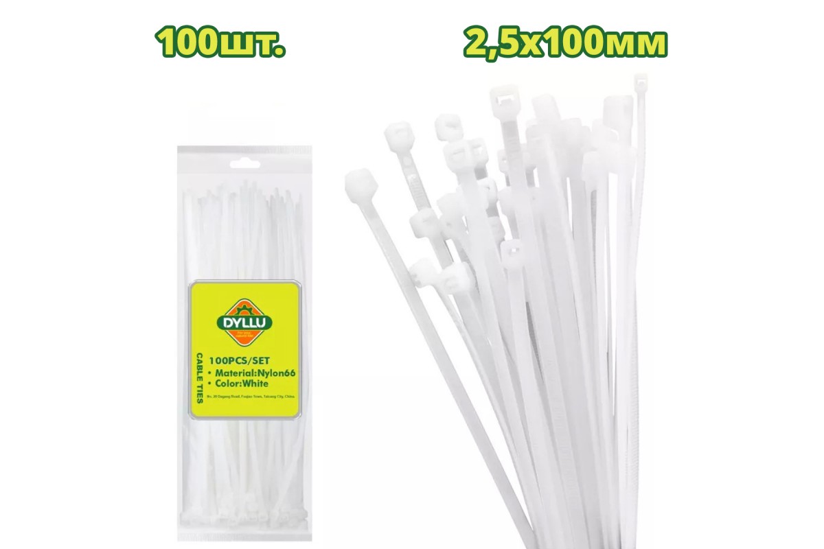 Характеристики: Цвет: белый Материал: нейлон 66 Длина: 100мм Ширина: 2.5мм В комплекте - 100шт.