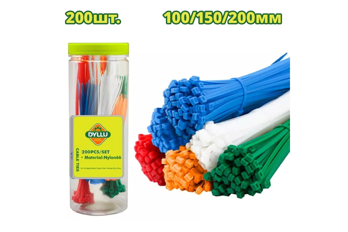 Характеристики: В комплекте - 200шт. Материал: нейлон 66 Красный (25шт.) - 100x2.5мм Желтый (25шт.) - 100x2.5мм Синий (25шт.) - 100x2.5мм Зеленый (25шт.) - 100x2.5мм Черный (50шт.) - 150x2.5мм Белый (50шт.) - 200x3.6мм
