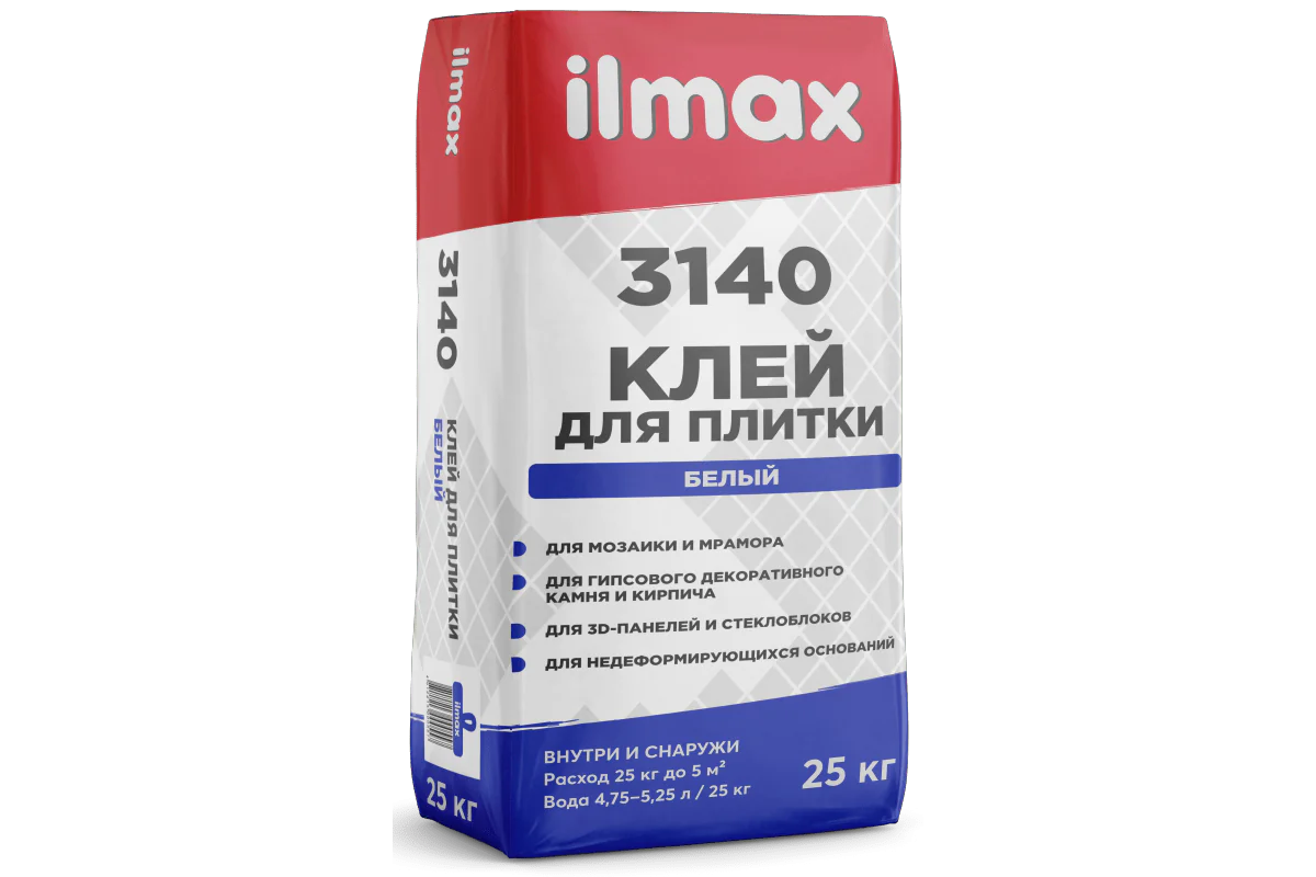 ilmax 3140 предназначен для приклеивания облицовочных материалов, склонных к просвечиванию и прокрашиванию: плиты из мрамора и светлых пород камня, стеклянная мозаика, искусственный и натуральный камень, декоративный камень и кирпич, 3D-панели, стеклоблоки, а также для декоративных покрытий на армирующей стеклосетке, керамической плитки (сторона до 70 см) и керамогранита (сторона до 60 см).