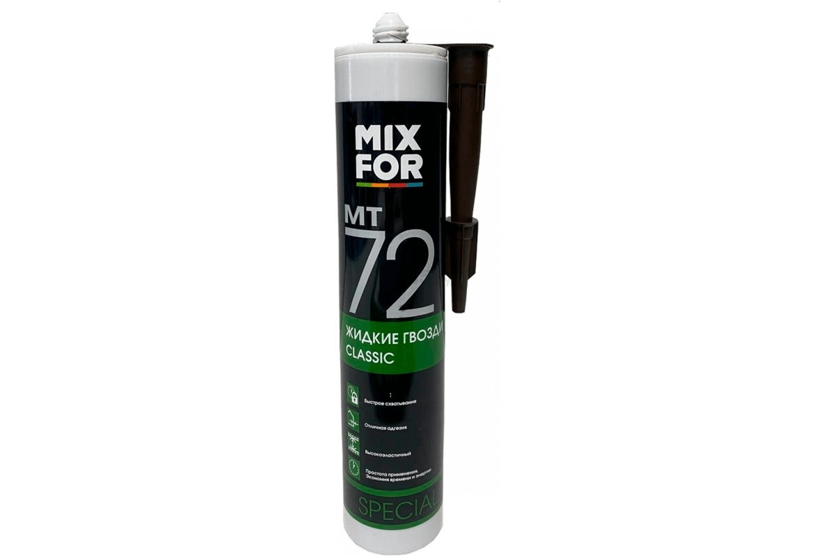 Клей монтажный каучуковый MIXFOR МТ72 Classic Жидкие гвозди бежевый 260 мл (МТ72) - однокомпонентный клей на основе синтетических каучуков в органических растворителях. Это универсальный продукт с широким спектром применения, который образует эластичный шов. Клей предназначен для различных монтажных и отделочных работ в строительстве. Расход - 300-500 г/м2. Время полного отверждения - 72-120 ч.