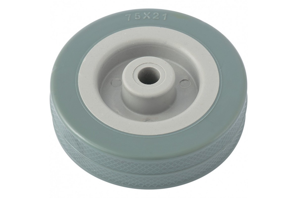 - Контактная поверхность выполнена из термопластичной серой резины, поэтому колесо может применяться на различных покрытиях, долгое время сохраняя рабочие качества.