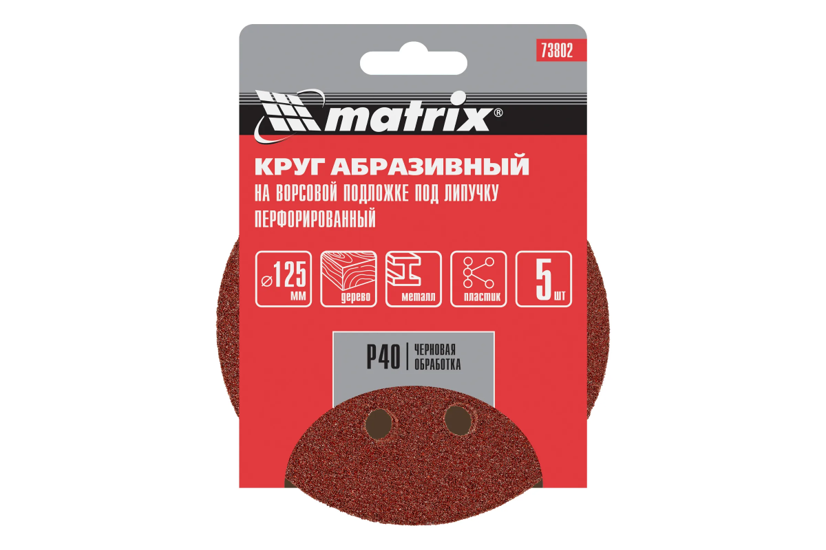 Перфорированный абразивный круг Matrix 73802 диаметром 125 мм, с крупнозернистым абразивом P 40, на ворсовой подложке под «липучку», 5 шт. в упаковке, используется для сухого чернового шлифования металла, древесины, пластика и других поверхностей. Позволяет избавиться от заусенцев, подходит для зачистки старого покрытия (краски/лака), удаления ржавчины, снятия слоя материала. Круг устанавливается на эксцентриковую (орбитальную) шлифовальную машинку с отводом воздуха или на дрель с помощью опорной насадки Matrix.