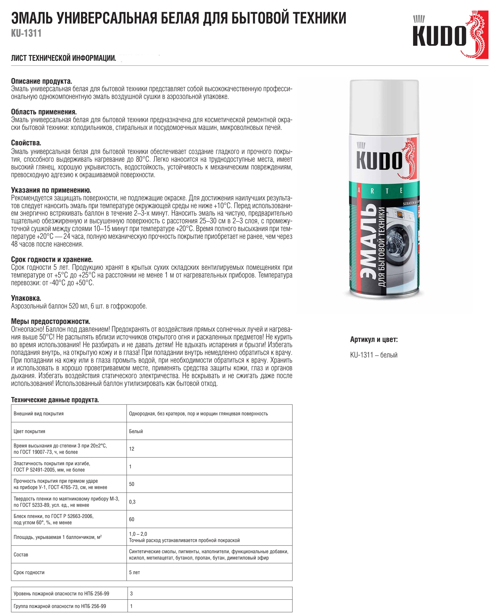 KUDO Эмаль для бытовой техники KU-1311 Белый 520мл