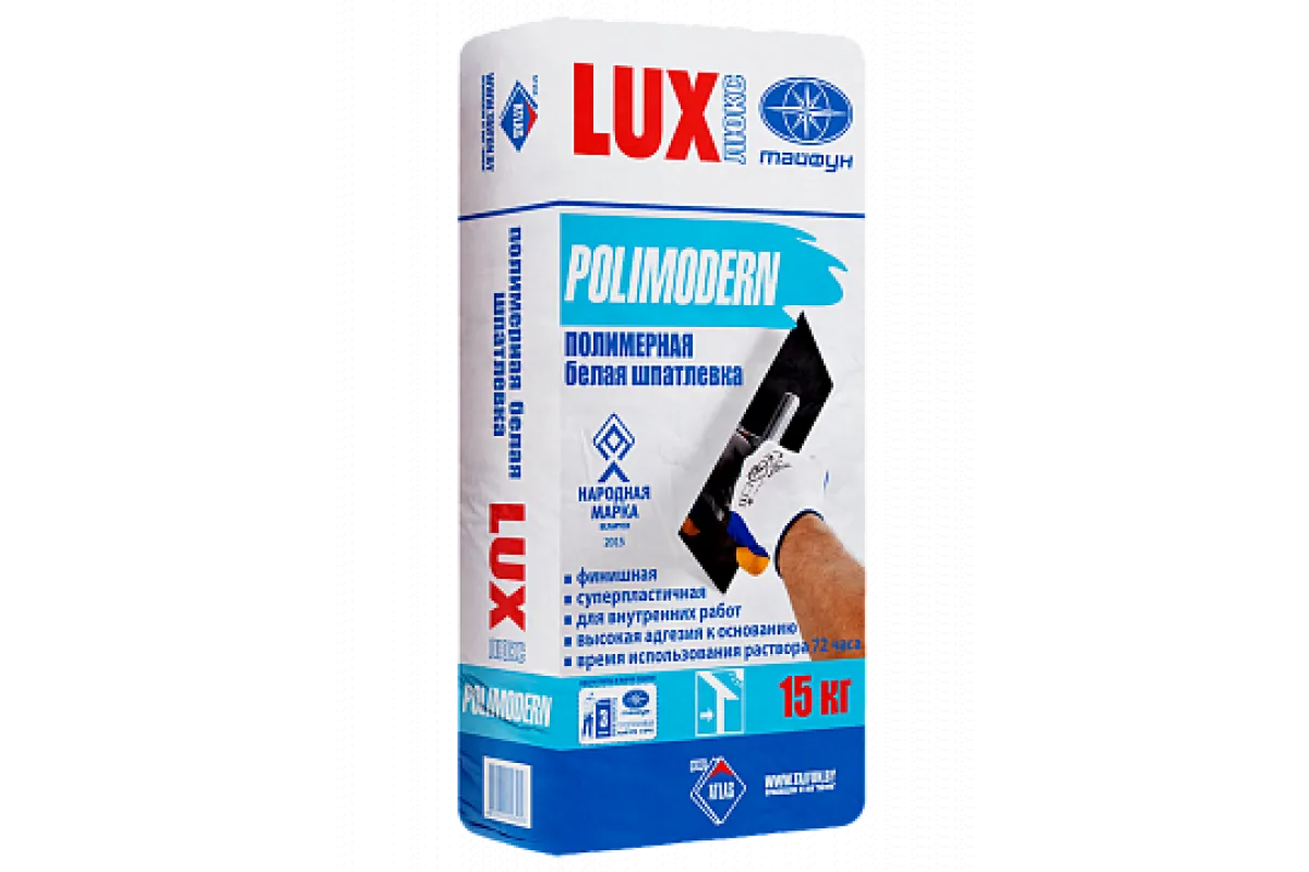 Шпатлевка полимерная белая Lux POLIMODERN применяется для высококачественной финишной отделки стен и потолков внутри помещений с нормальным температурно-влажностный режимом эксплуатации. По бетонным поверхностям, цементно-известковым, цементным и гипсовым штукатуркам и шпатлевкам, гипсовым плитам, гипсоволокнистым и гипсокартонным листам. Средний расход 15 кг на 15 м2.