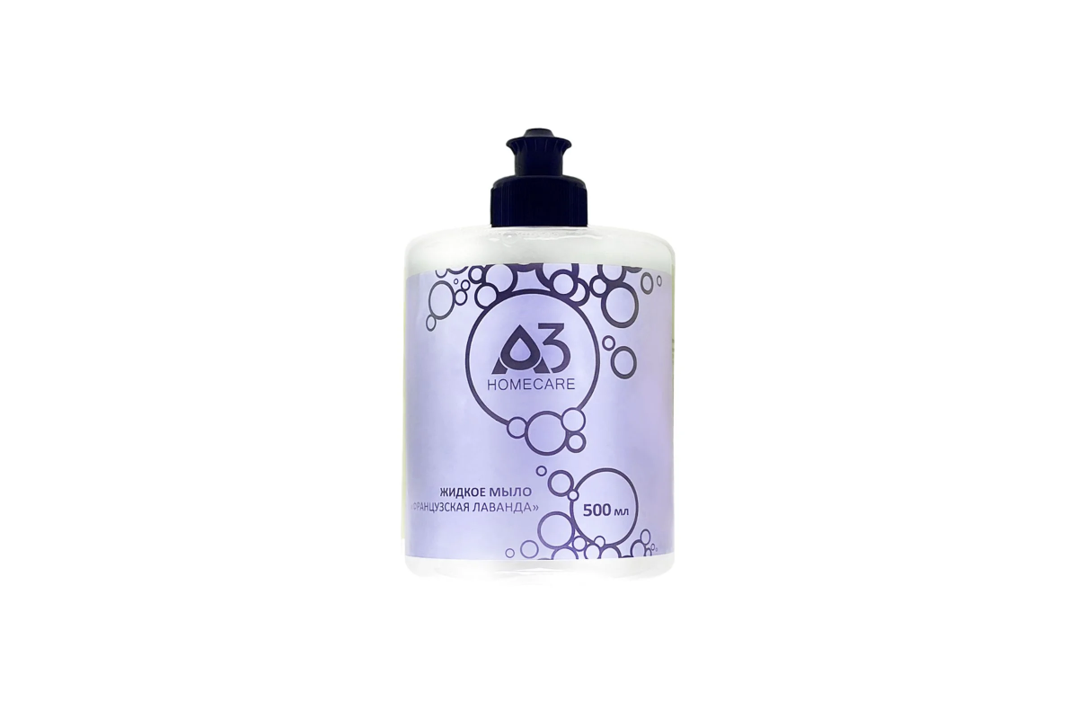 Жидкое мыло для рук "Французская лаванда" A3 HOMECARE, 0,5 литров предназначено для бережного ухода за руками. Подойдет для всех типов кожи, не вызывает раздражения, сухости и чувства стянутости. Гипоаллергенное, можно использовать детям. Подходит для ежедневного ухода. Легкий ненавязчивый аромат лаванды. Гелеобразное, перламутрового цвета, не водянистое (экономичный расход), умеренно пенится. В составе есть крема, поэтому не сушит кожу и подпитывает ее, можно использовать в холодной воде. В составе есть натуральные компоненты, увлажняющие и освежающие кожу: глицерин, лимонная кислота, экстракты жасмина или лаванды. Нейтральный pH, поэтому можно использовать для тела. Изготовлено по авторской рецептуре согласно ГОСТу.