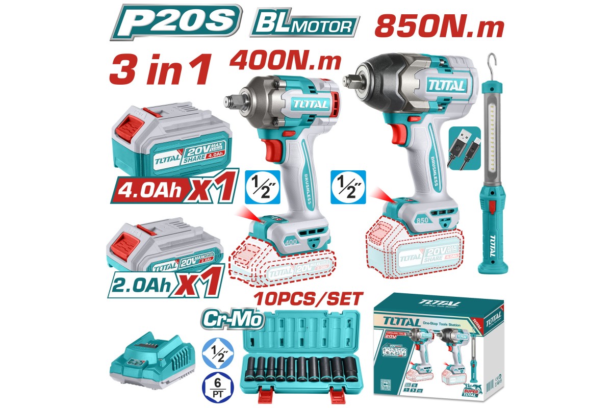 Характеристики: 20V, бесщ., гайк-т 400Нм: 0-1600/2100/2400об/мин 1/2", гайк-т 850Нм: 0-1600/1900/2100об/мин, 1/2", фонарь 3,5вт, P20S, 2 АКБ