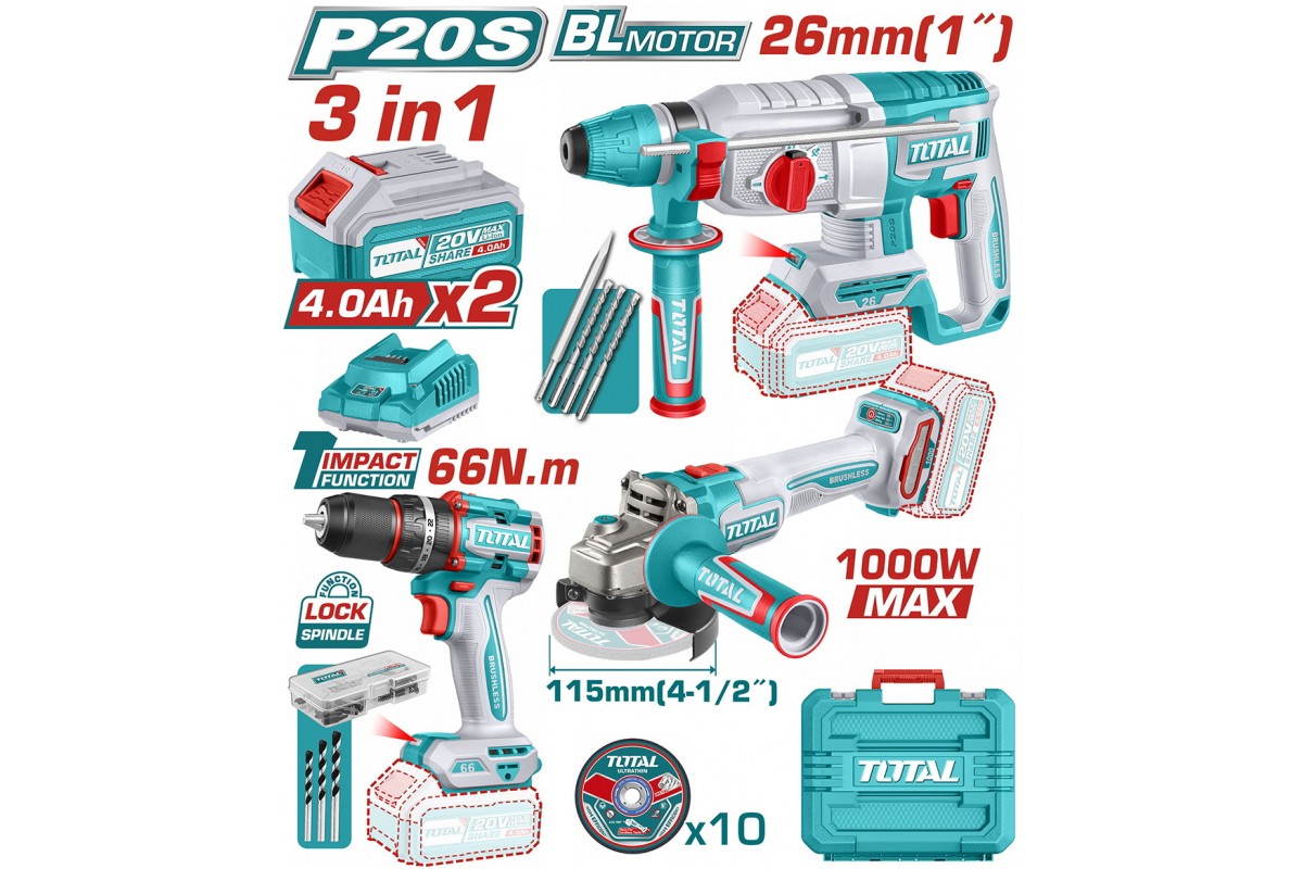 Характеристики: 20V, бесщ., дрель-шур.:66Нм, 0-500/2000об/мин, УШМ: бесщ., 115мм, 3000/6000/9000 об/мин, перфоратор: SDS+, 2Дж,0-1100об/мин, P20S, 1 АКБ