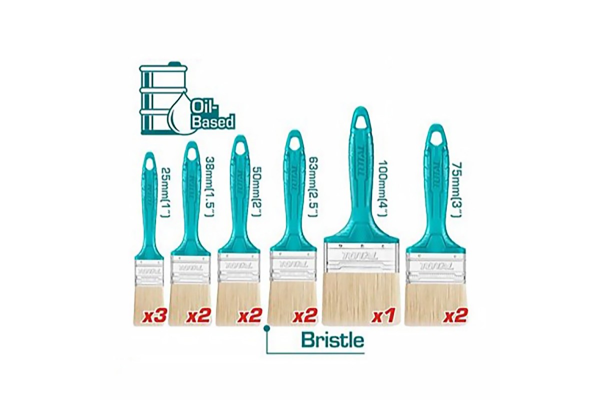 Характеристики: Для масляной краски, Кисти 25 мм - 3 шт. Кисти 38 мм - 2 шт. Кисти 50 мм - 2 шт. Кисти 63 мм - 2 шт. Кисть 75 мм - 2 шт. Кисть 100 мм - 1 шт.,Материал ручки - пластик, Щетина натуральная