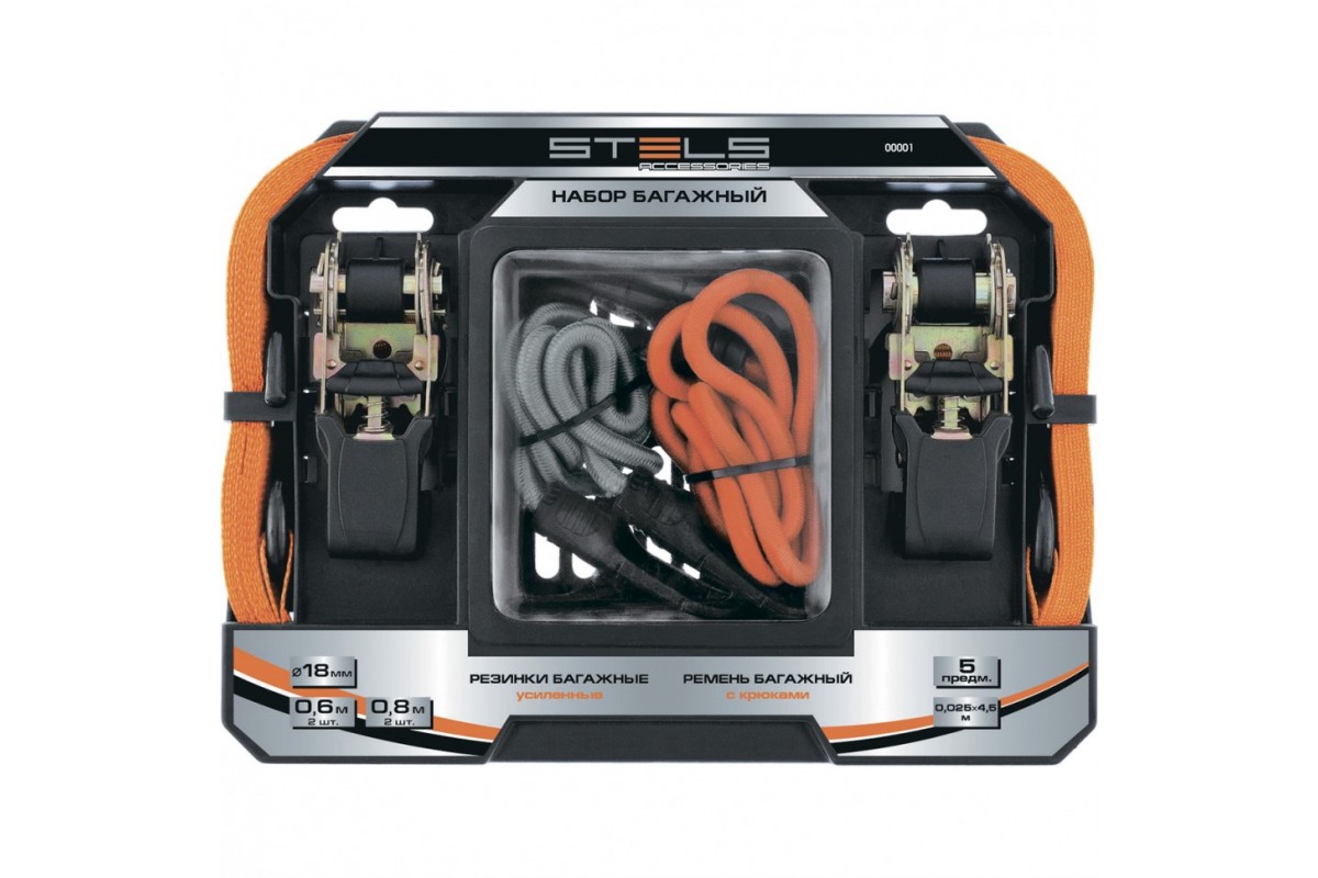 Набор стяжек и резинок Stels 54403 используется для фиксации грузов и будет полезен в автопутешествии. В комплекте ремни с храповыми механизмами, а также резинки разной длины с крюками. Разрывная нагрузка ремней составляет 680 кг, а эластичных стяжек — 50 кг, поэтому они надежно фиксируют предметы различных габаритов, предотвращая их смещение во время перевозки.