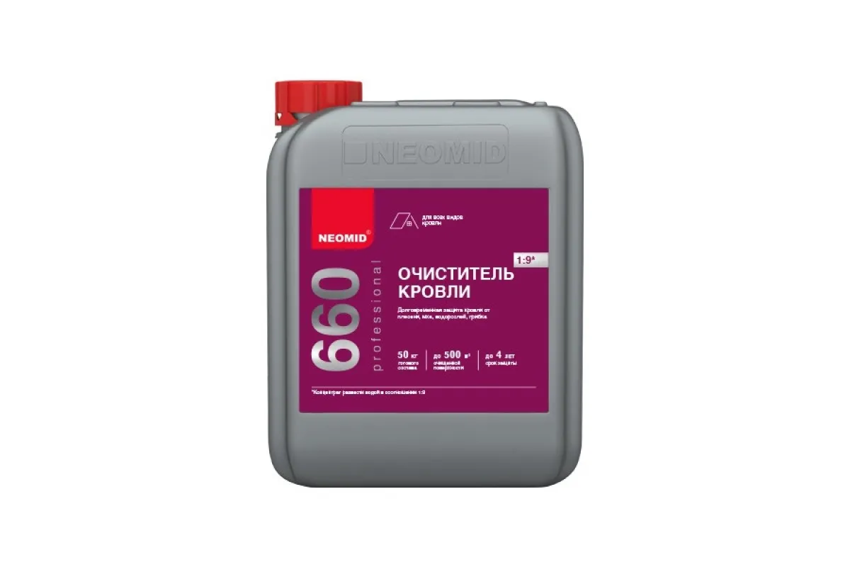 Моющее средство для кровли Neomid 660 Cleaning 5 кг Н-660-5/к1:9 предназначено для удаления и подавления роста мха, плесени, грибков, водорослей, а также других биопоражений на любых видах мягкой и жесткой кровли (черепица, в том числе битумная, металлочерепица, шифер, еврошифер, профлист, штучный кровельный материал).