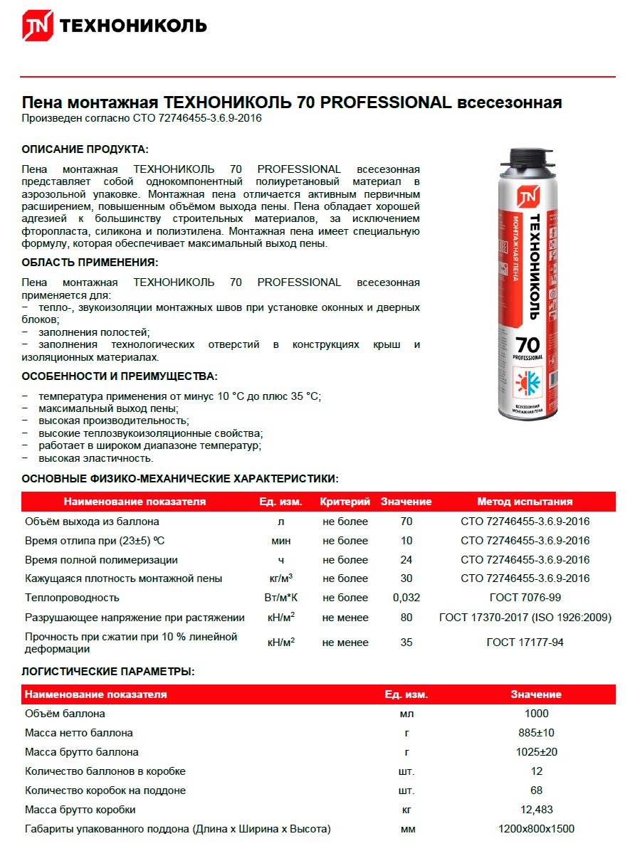 Пена монтажная профессиональная ТЕХНОНИКОЛЬ 70 PROFESSIONAL 890мл