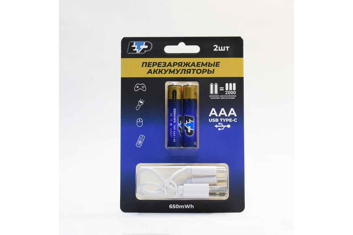 Перезаряжаемые аккумуляторы ААА, 1,5V 650mwh, Блистер (2шт) + кабель TYPE-C ETP