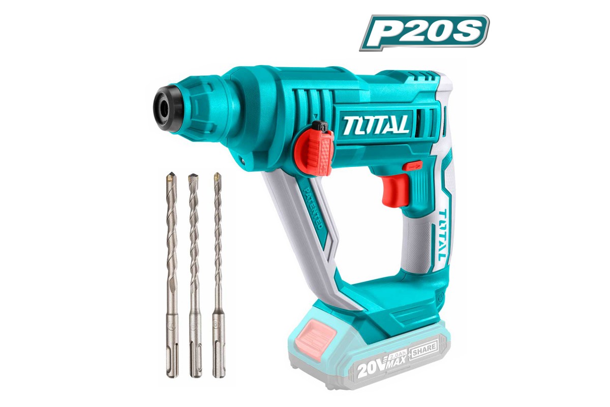 - Перфоратор входит в линейку инструментов TOTAL P20S и совместим со всеми аккумуляторами TOTAL 20В - TFBLI20011, TFBLI2002, TFBLI2053.