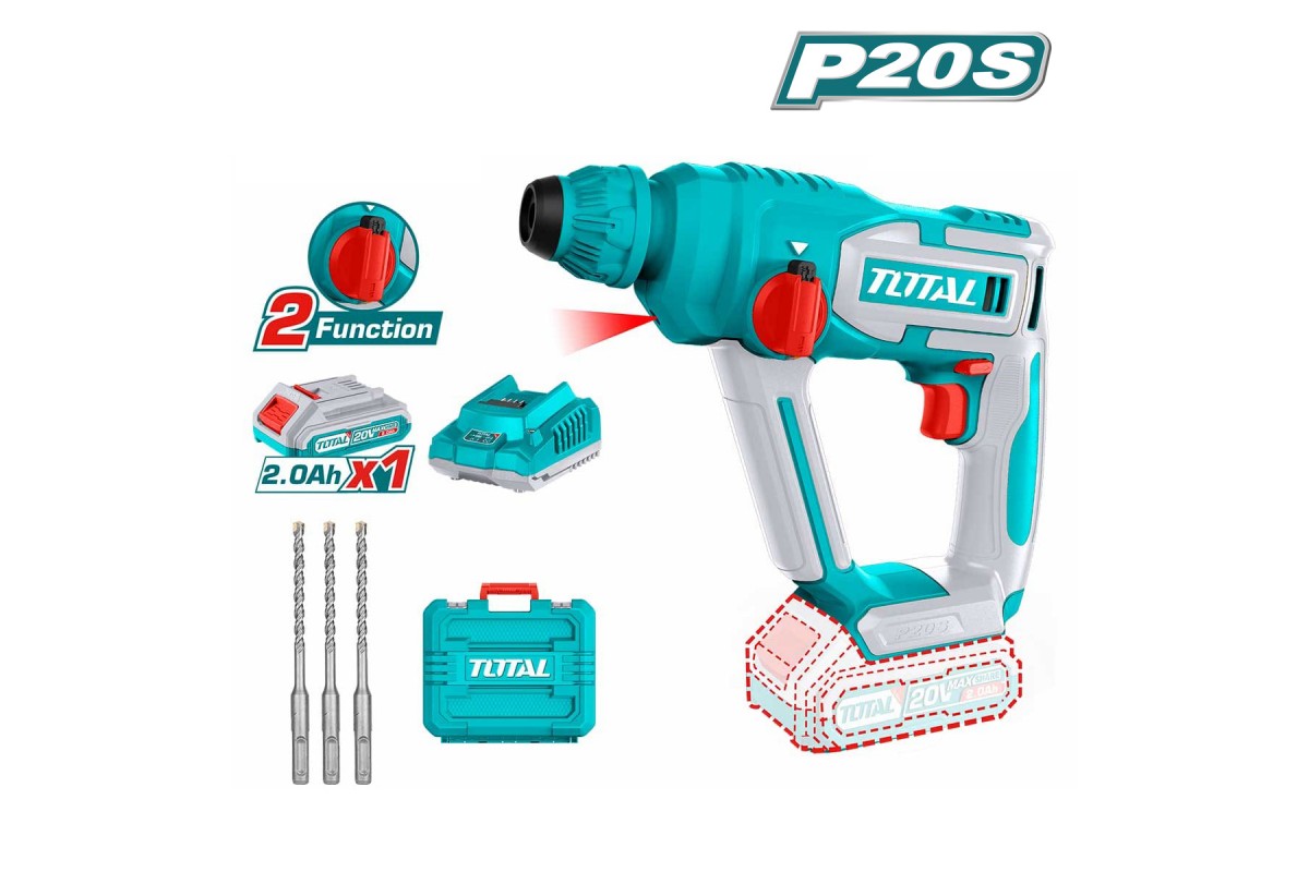 - Перфоратор входит в линейку инструментов TOTAL P20S и совместим со всеми аккумуляторами - - TOTAL 20В - TFBLI20011, TFBLI2002, TFBLI2053.