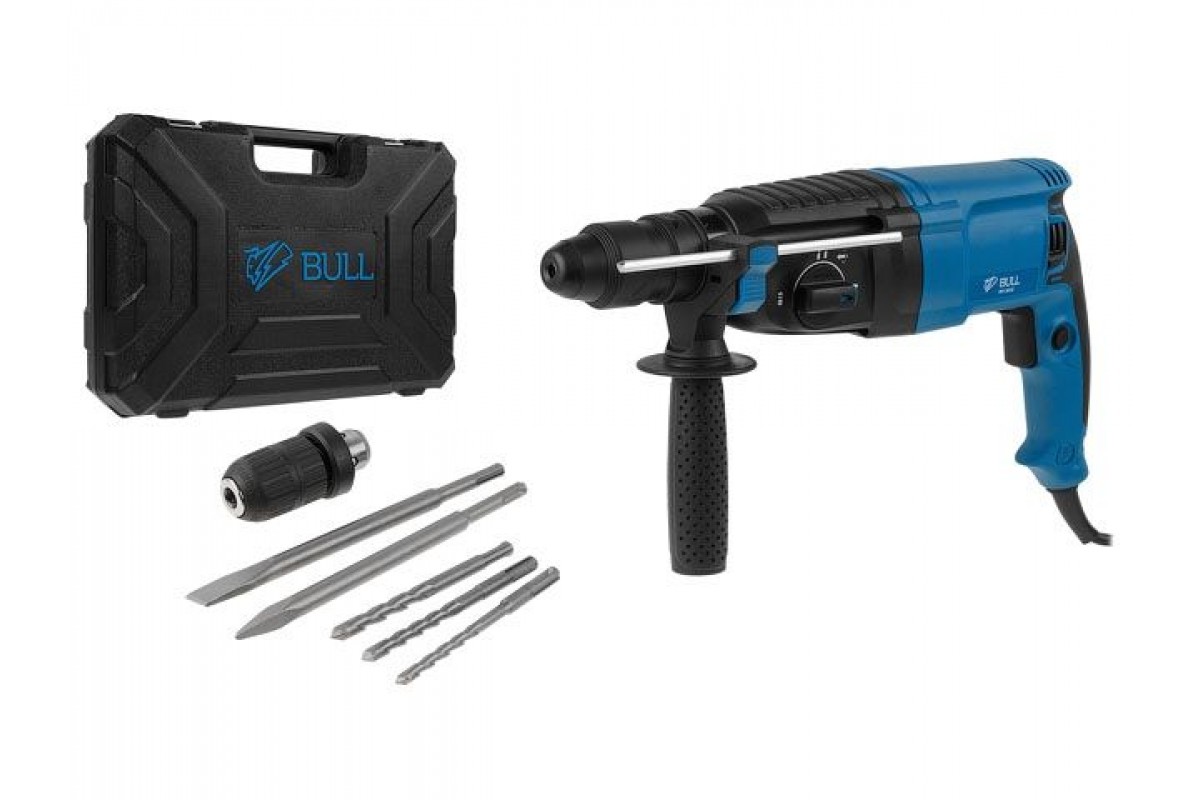 Перфоратор BULL BH 2602 в чем. 800 Вт, 3.0 Дж, 4 реж. + 2 зубила, 3 сверла, БЗП в комплекте (800 Вт, 3.0 Дж, 4 реж., патрон SDS-plus, БЗП в комплекте, (01045325)