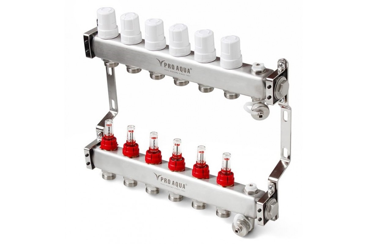 Коллекторный блок с расходомерами и автоматическими воздухоотводчиками 6 выходов, 380мм, 1*3/4 PRO AQUA V500MB.AV.06