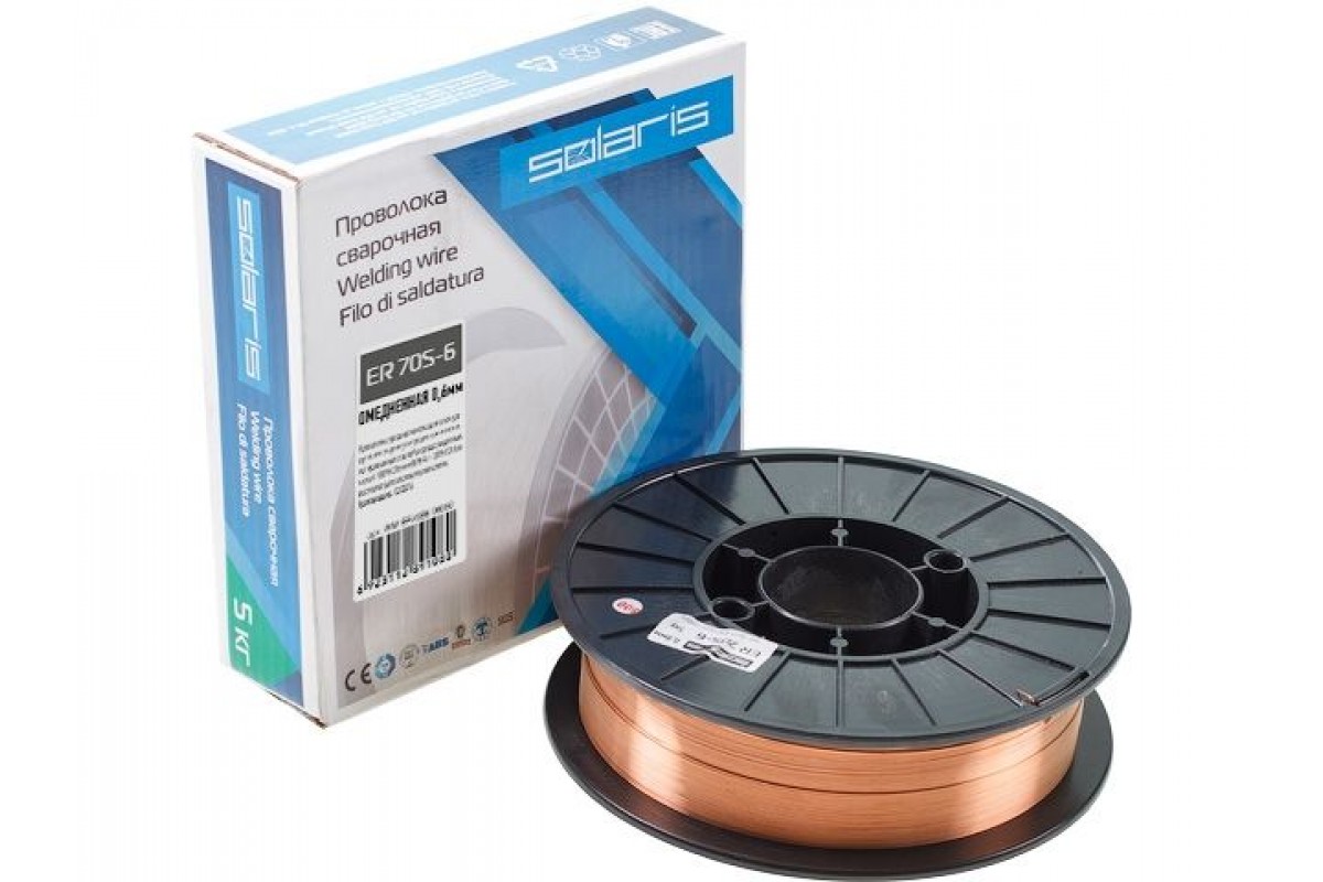 Проволока сварочная омедненная ER 70S-6 ф0,6мм (катушка D200 5 кг) SOLARIS