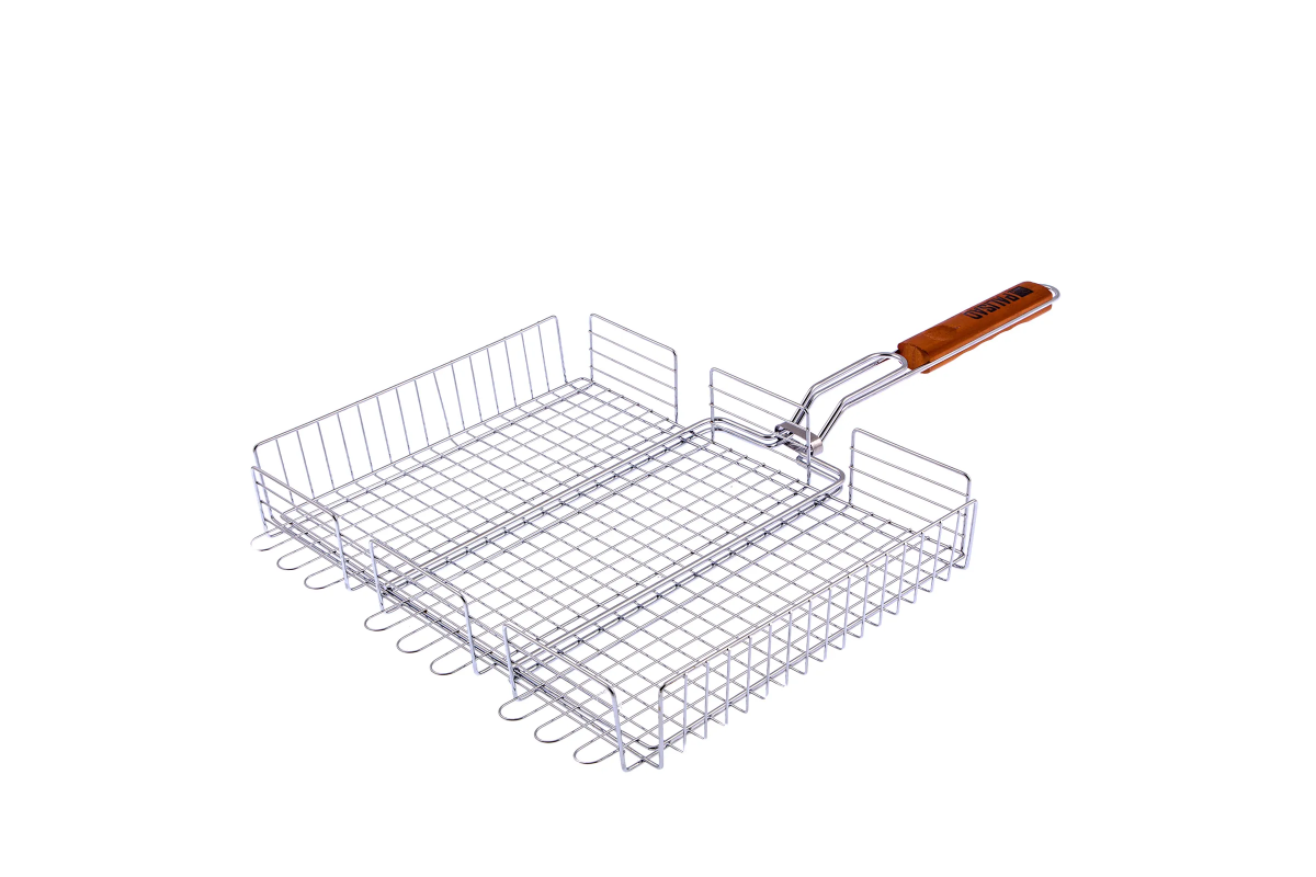 - За счет увеличенных опорных стержней решетка надежно фиксируется на мангале, а для жарки используется вся рабочая площадь.