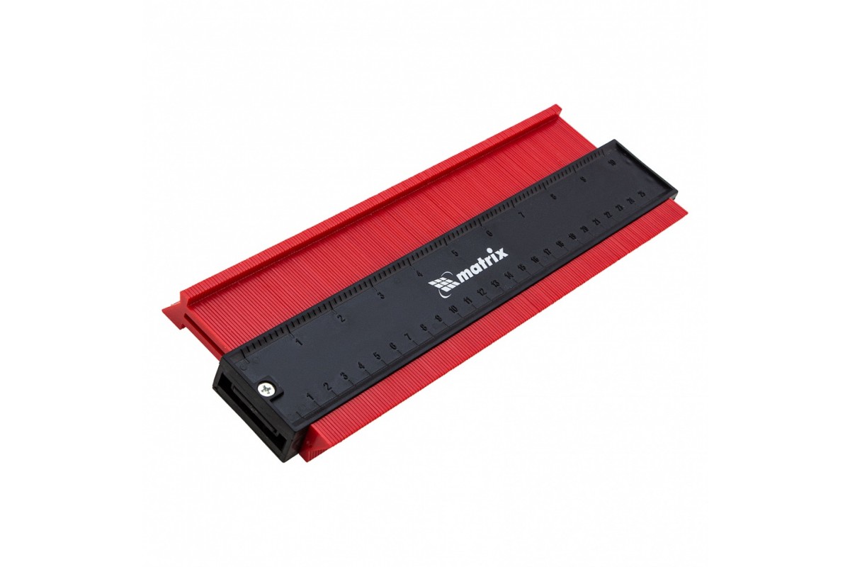 Пластиковый шаблон для копирования профиля Matrix 88104 предназначен для копирования и переноса контуров различных форм. Шаблон необходим для точной подрезки отделочных материалов (ламинат, линолеум, кафельная плитка, гипсокартон и др.) при обходе труб водоснабжения, углов и других рельефных препятствий. Перенос контуров осуществляется при помощи выдвижных пластиковых пластин. Шаблон оснащен измерительной шкалой длиной 25 см.