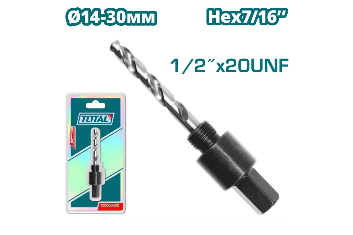 Характеристики: Оправка для кольцевой пилы 7/16" шестигранный хвостовик размер резьбы: 1/2"-20UNF Подходит для кольцевых пил: 9/16"(14 мм) до 1-3/16"(30 мм) со сверлом HSS 6 мм