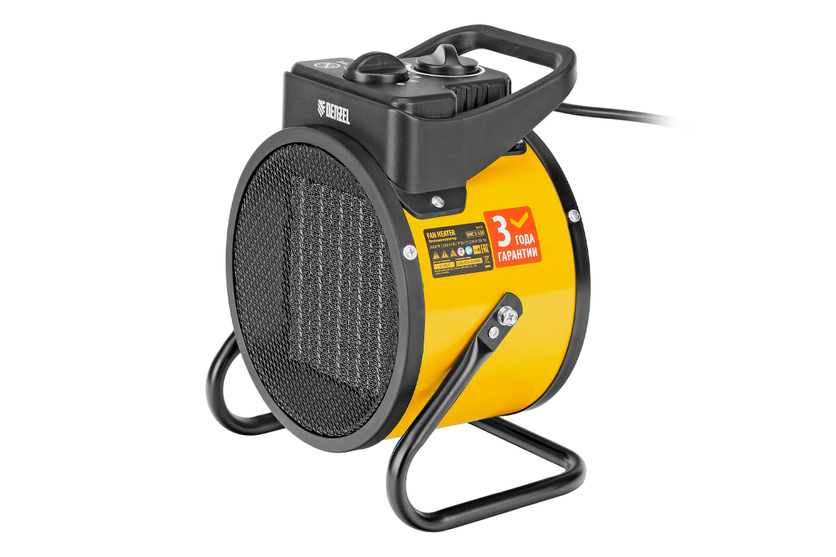 Тепловая пушка (тепловентилятор) Denzel DHC 3-150 96431 с керамическим нагревателем потребляет мощность 0,025, 1,5 или 3 кВт в зависимости от установленного режима и подходит для бытового и полупрофессионального применения. С ее помощью можно обогреть помещение площадью до 40 кв. м или дистанционно просушить поверхность после отделки (оштукатуренные и окрашенные стены, стяжки). Также устройство можно использовать как вентилятор в жару. Керамический нагревательный элемент не сушит воздух и не выделяет вредных веществ, поэтому тепловентилятор безопасен для людей и животных.