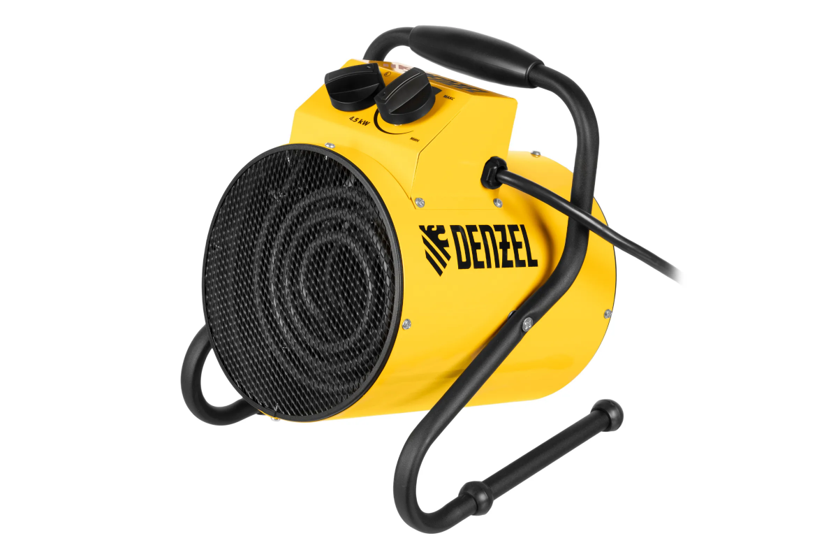 Тепловая пушка профессиональной серии Denzel SFH-5000 96438 питается от сети 230 В и генерирует воздушный поток мощностью 260 м³/ч. Работает в одном из 3 режимов: вентилятор, обогрев на мощности 2250 и обогрев на мощности 4500 Вт. Используется в складских, производственных, общественных помещениях площадью до 45 м². Подходит для дистанционной просушки поверхностей, например, окрашенных или оштукатуренных стен во время отделочных работ.